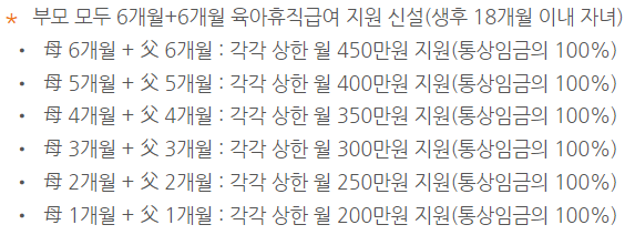 생후 18개월 이내의 같은 자녀에 대하여 부모 모두 육아휴직을 사용하는 경우, 첫 6개월에 대한 부모 각각의 육아휴직 급여를 통상임금의 100%로 상향지급합니다.(2024년 1월 1일부터 적용)