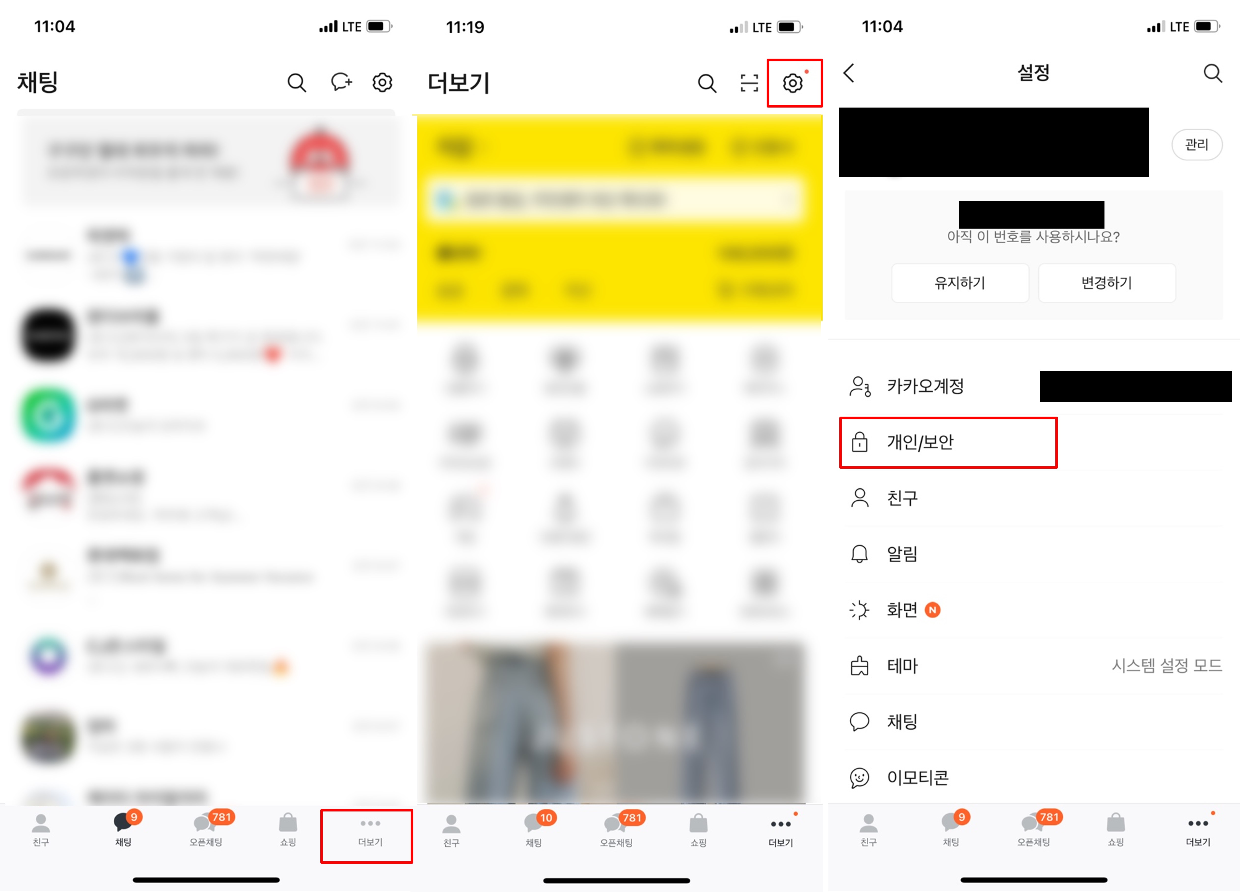 카톡의 비번변경은 카톡 아이도 확인과 같은경로이며, 카톡>더보기(오른쪽맨아래)>설정(오른쪽 위쪽의 톱니바퀴)> 개인/보안> My 비밀번호관리에서 변경 가능합니다.