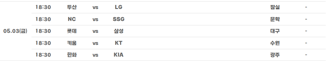 5월초 어린이날을 포함한 야구경기 일정입니다. 5월 1일 근로자의 날을 시작으로 5월 2일, 5월 3일의 학교의 재량휴일과 부모님의 휴가등을 사용할 수 있다면 총 6일의 긴 휴가를 사용할 수 있습니다.